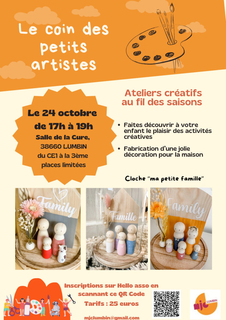 Stage loisirs créatifs avec Marlène: Cloche » ma petite famille » Le 24 Octobre de 17h à 19h à la Cure Adhésion offerte cett Du CE1 à la 3ème Pour vous inscrire: https://www.helloasso.com/associations/maison-des-jeunes-et-de-la-culture-association-d-education-populaire-de-lumbin/evenements/le-coin-des-petits-artistes-avec-marlene Nous vous attendons nombreux !