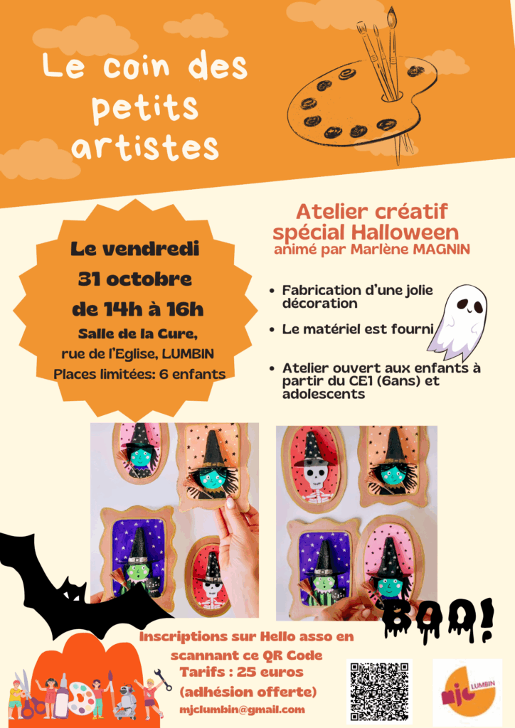 Nouvel atelier avec Marlène sur le thème d’Halloween ! Vendredi 31 Octobre de 14h à 16h à la Cure. Adhésion offerte cette année, 25euros le stage Pour vous inscrire: https://www.helloasso.com/associations/maison-des-jeunes-et-de-la-culture-association-d-education-populaire-de-lumbin/evenements/le-coin-des-petits-artistes-avec-marlene Nous vous attendons nombreux !