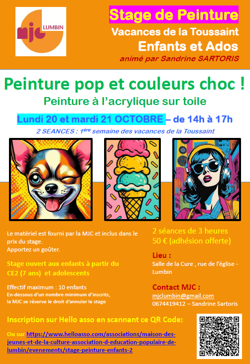 Stage de peinture avec Sandrine: Peinture pop et couleurs choc ! Lundi 20 et Mardi 21 octobre de 14h à 17h à la Cure Adhésion offerte cette année, 50euros le stage Pour enfants à partir de 7 ans et adolescents Matériel fourni, prévoir un goûter. Pour vous inscrire: https://www.helloasso.com/associations/maison-des-jeunes-et-de-la-culture-association-d-education-populaire-de-lumbin/evenements/stage-peinture-enfants-2 Nous vous attendons nombreux !